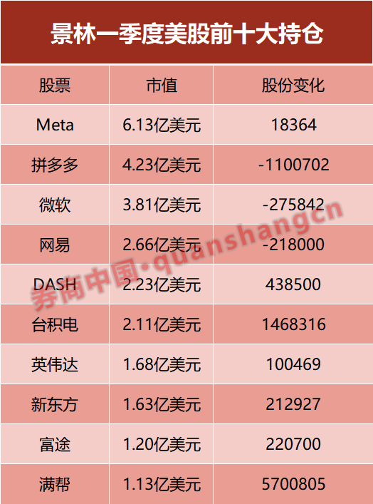截止一季度末,景林的美股持仓总市值达32.26亿美元,较去年底的28亿美元,增幅达15%。前十大重仓股为META、拼多多、微软、网易、Doordash、台积电、英伟达、新东方、富途、满帮。