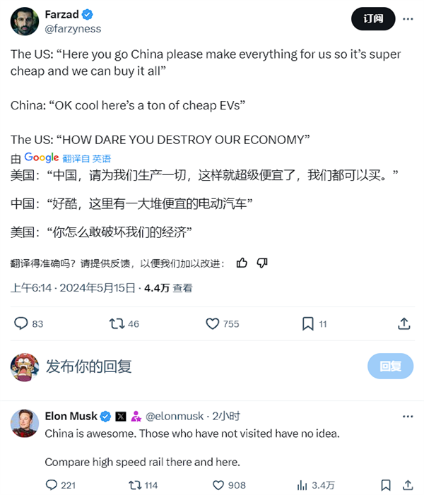 在评论区,特斯拉CEO马斯克现身并留言评论称:中国真棒,没去过的人根本不知道,比较一下那里和这里的高铁。
