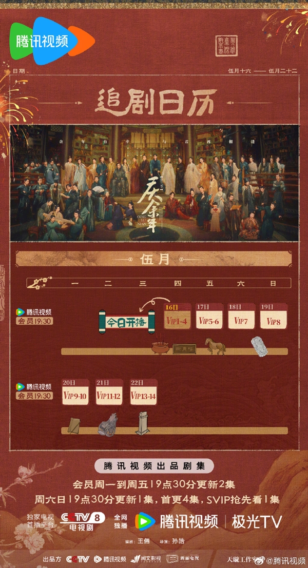 今日,腾讯视频发布《庆余年2》首周追剧日历,会员周一到周五19:30更新2集,周六日19:30更新1集,首更4集,SVIP抢先看1集。