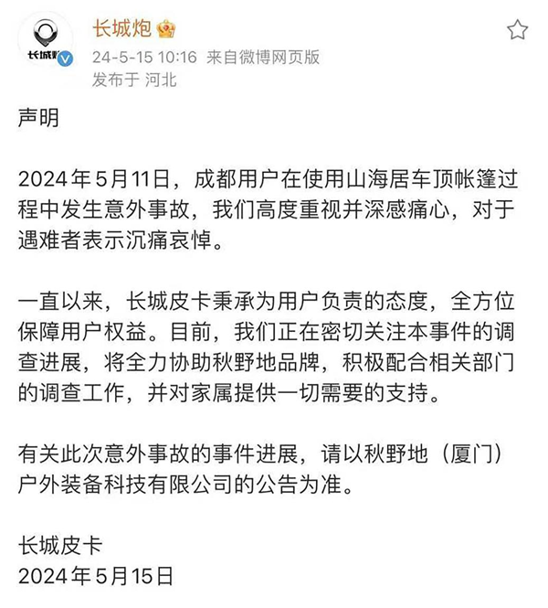 长城汽车和帐篷生产方秋野地品牌迅速做出回应,长城汽车表达了对遇难者的沉痛哀悼,并承诺全力配合调查,为家属提供必要支持。