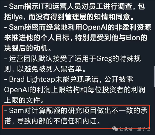 一来算力不够用,承诺给超级对齐团队的20%缺斤少两,导致团队逆流而行,但也越来越困难。
