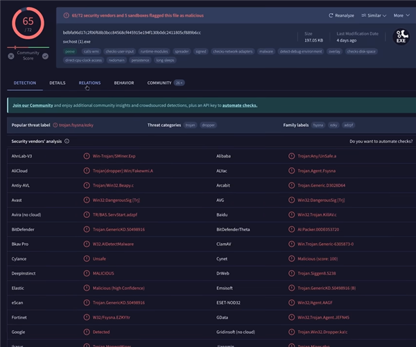 通过将系统上传到病毒检测网站VirusTotal,瞬间就检测出了几十种病毒等。
