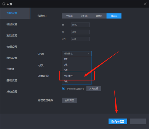 第四步:点击选择“4核(推荐)”,即可设置运行性能。