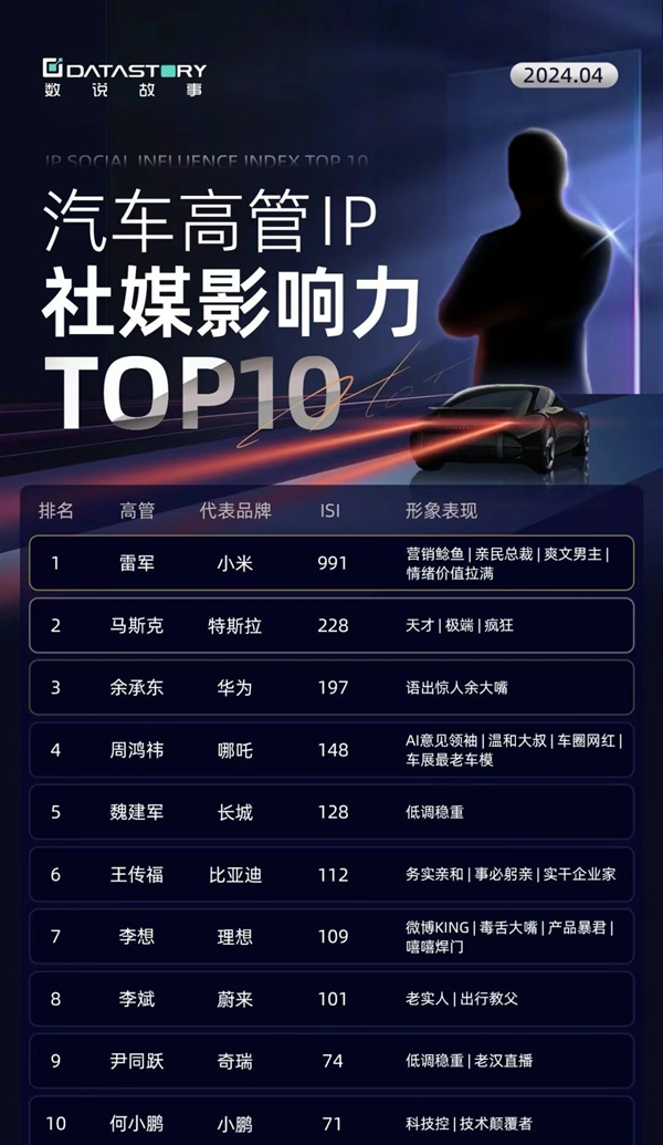 5月20日消息,近日网络上曝光了一张汽车高管IP社媒影响力TOP10榜单,从内容看,该图作者为数说故事。