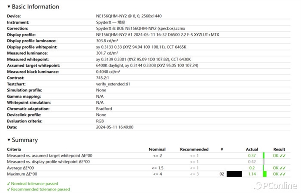 七彩虹隐星G1524屏幕来自于京东方,软件识别型号为NE156QHM-NY2,使用校色仪对屏幕进行测试,实测色域覆盖为94.2%sRGB,使用亮度仪实测屏幕中心区域最大亮度为336尼特。
