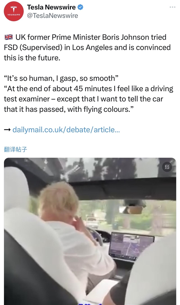 5月21日消息,据报道,近日,英国前首相鲍里斯约翰逊在美国洛杉矶,体验了特斯拉最新版的FSD,并给出了相当高的评价。