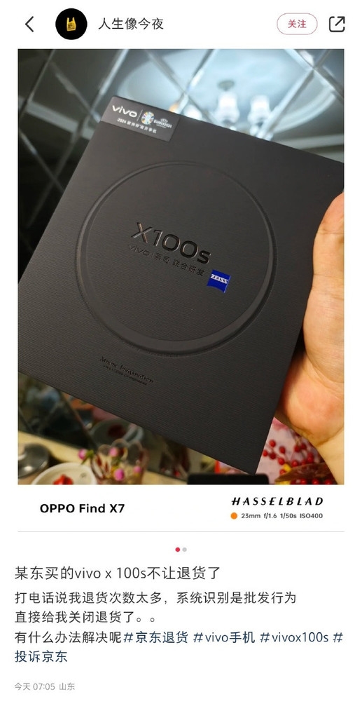 近日,一名网友发帖求助:某东买的vivo X100s不让退货了。客服打电话说我退货次数太多,系统识别是批发行为,直接给我关闭退货了。其还询问其他网友,有什么办法解决。