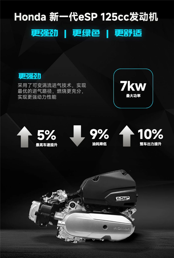 动力系统方面,这款摩托采用新款eSP 125cc发动机,最大功率7千瓦,峰值扭矩10牛米,车辆重107kg,油箱容积同样为5.7L。