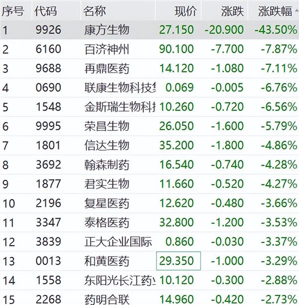 另外,今日上午港股生物制药板块大跌。康方生物盘中数次跳水,盘中跌幅一度近45%;百济神州跌超7%。