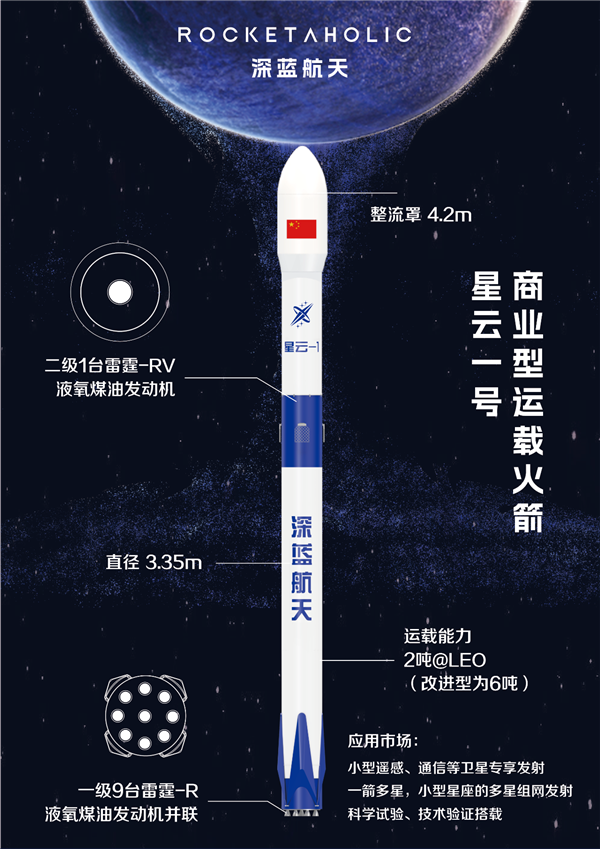 首飞火箭为2级构型,直径3.35米,近地轨道运力约为2吨,配备10台雷霆-R液氧煤油发动机,可根据任务载荷大小选用直径3.35m/2.25m两款整流罩。