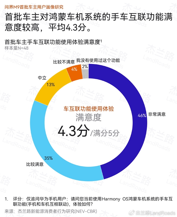 满意度:首批车主对AITO问界M9的总体满意度为4.5分,对智能的评价最高,对服务的评价较低。