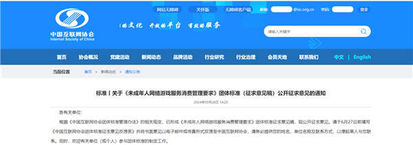 5月28日消息,今日,中国互联网协会发布《未成年人网络游戏服务消费管理要求(征求意见稿)》团体标准。