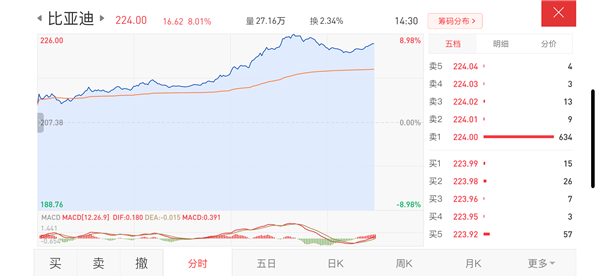 今天股市开盘后,比亚迪股票高开高走,盘中最高涨幅达到8.95%。截至发稿时,涨幅仍保持在8.01%,最新股价为224港元,市值高达6500亿港元。