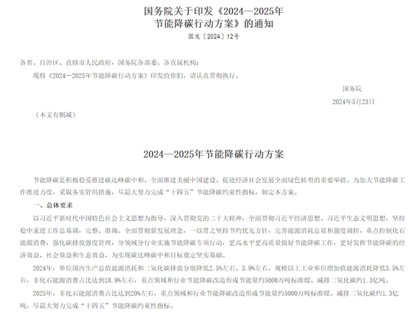 5月29日消息,国务院印发《20242025 年节能降碳行动方案》。