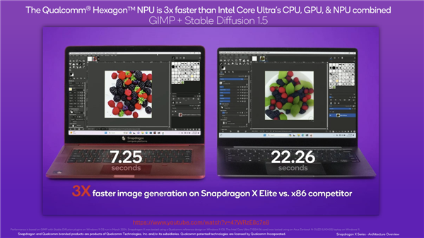 此外,高通还展示了Snapdragon X Elite(X1E-80-100)在特定应用场景中的性能,例如在Procyon AI测试,以及在GIMP + Stable Diffusion 1.5和Luminar Neo中进行图像生成和照片编辑时的表现。高通表示,在这些应用场景中,Snapdragon X Elite的性能同样优于竞争对手。