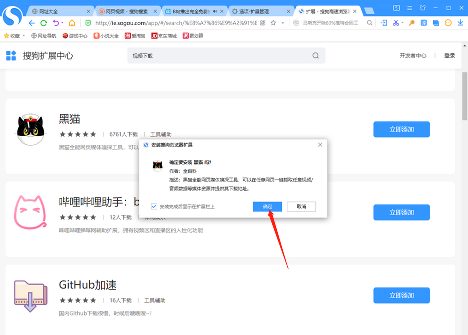 3、进入后,在上面的搜索框中输入几个字,下面就会出现一些与视频下载相关的插件。然后选择一个您认为合适的插件并单击按钮。