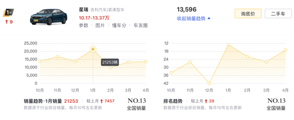 通过懂车帝的销量数据可以看到,吉利汽车品牌下,月销最高的车型是售价区间为10.17 ~ 13.37万元的A级轿车星瑞。而这辆车在车身尺寸上不仅略小于秦L和海狮06 DM-i,也不能享受插混车拥有的免购置税权益。