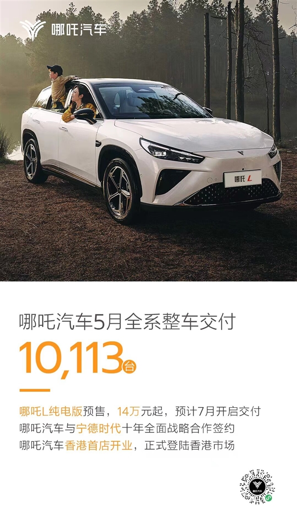 6月1日消息,今天,哪吒汽车官方宣布,哪吒汽车5月全系整车交付10113台,哪吒L纯电版预计7月份开启交付,预售价14万元起。