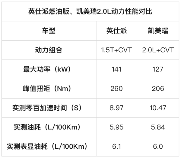 首先,在动力性能的维度,我们可以通过客观的数据看到,英仕派1.5T燃油版相较于凯美瑞2.0L,无论是动力参数还是车辆的实际加速性能,都处于更优的状态。