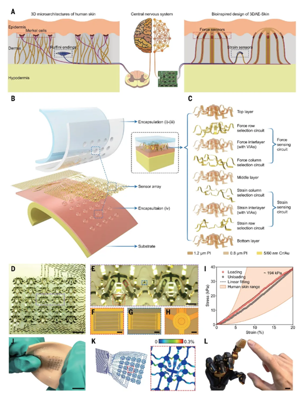6月5日消息,据清华大学官网,清华大学航天航空学院、柔性电子技术实验室张一慧教授课题组在国际上首次研制出具有仿生三维架构的新型电子皮肤系统,可在物理层面实现对压力、摩擦力和应变三种力学信号的同步解码和感知,对压力位置的感知分辨率约为0.1毫米,接近于真实皮肤。