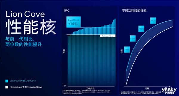 根据英特尔公布的数据,Lunar Lake对比Meteor Lake性能核IPC平均提升约14%,而且Lunar Lake在越低功耗下的表现优势越明显。