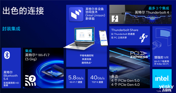 Lunar Lake提供最多4条PCIe 5.0、4条PCIe 4.0总线通道;支持Wi-Fi 7(5G Gig),最高速率达5.8Gbps,支持蓝牙5.4;这一次还是没有雷电5,支持的雷电4带宽40Gbps,最多三个连接,而且支持新的雷电共享技术,实现不同PC之间快捷分享、传输与控制。