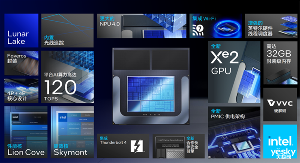 根据英特尔公布的内容显示,Lunar Lake整体功耗相比上代下降40%;核显的游戏和图形性能提高1.5倍;全新NPUAI性能最高可达前代4倍,平台AI算力高达120TOPS。