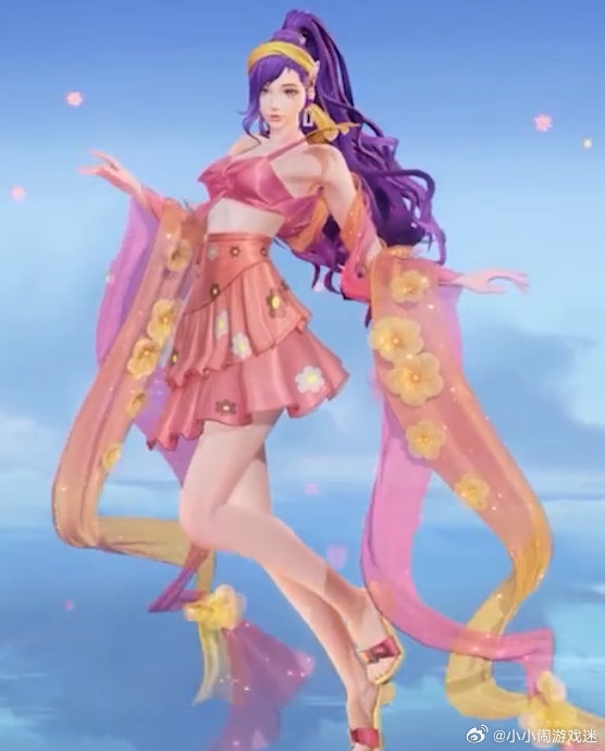 此次设计团队为貂蝉设计了全新的充满夏日氛围的形象。发型方面,紫色长发搭配黄色头饰飘带,色彩搭配鲜艳亮丽,营造出夏日浪漫的画面。
