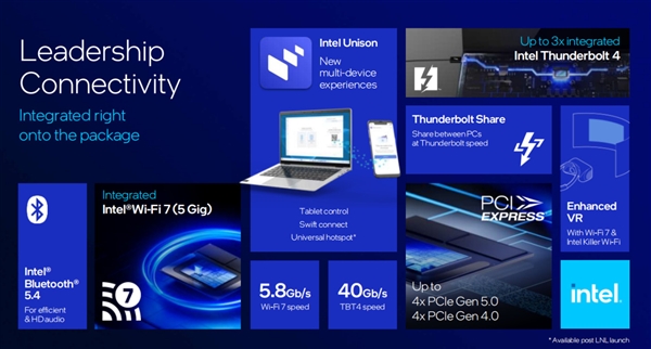 具体来看,IntelLunarLake支持Wi-Fi7无线网络,速率可达5.8Gb/S,在Wi-Fi7无线网络的支持下,VR的体验也会就此提升,同时还支持蓝牙5.4标准。40Gb/S带宽的雷电4自然LunarLake上是原生就支持的,一个接口即可完成供电、数据传输、视频输出等多项功能。PCIe通道最高支持4*PCIe5.0。