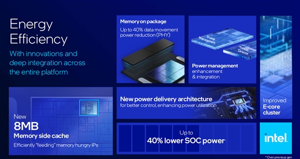 4P核+4E核的核心规模虽然看着略显单薄,但在商务办公或学习场景中,这样的核心规模与单核性能足以完全覆盖,并且在Intel专门为LunarLake打造的全新线程调度的加成下,预计将大幅度提升续航能力,根据英特尔官方给出的数据,LunarLake整个SoC的功耗相比于前代产品会有40%的下降,LunarLake将为X86处理器带来更高维度的续航表现,这将非常适合经常在外办公的差旅人士,打消对于X86产品的续航焦虑。