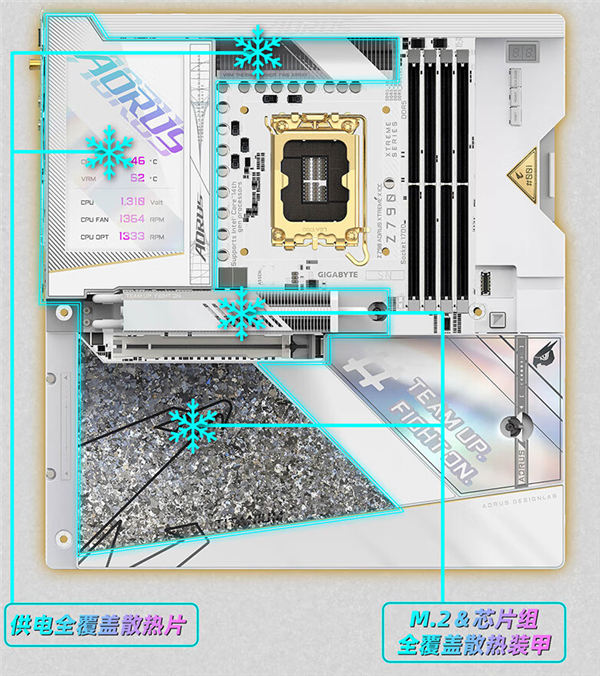 散热装甲全面覆盖供电电路、芯片组、M.2插槽,还有金属背板,后两者支持快易拆。