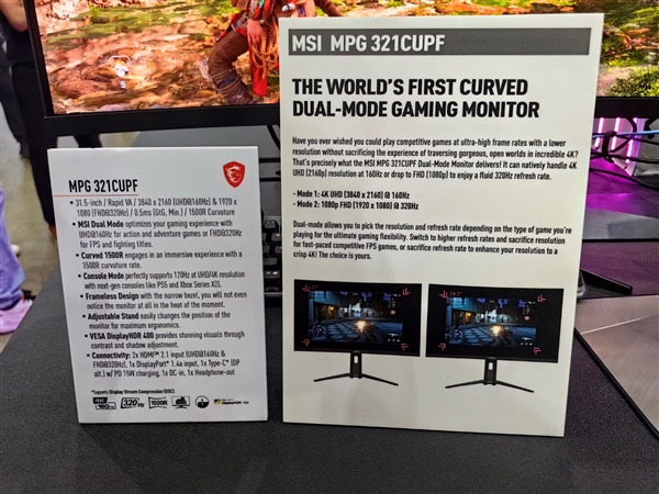 全球第一款双模曲面显示器,可选4K/160Hz或者1080p/320Hz,可以根据不同游戏选择高分或者高刷,兼顾高画质和高帧率。