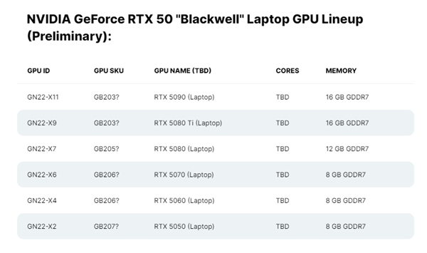 据了解,基于Blackwell架构的RTX 50系列移动显卡至少有6款型号正处于开发中,全系采用最新的GDDR7显存,最高显存容量可达到16GB。包括: