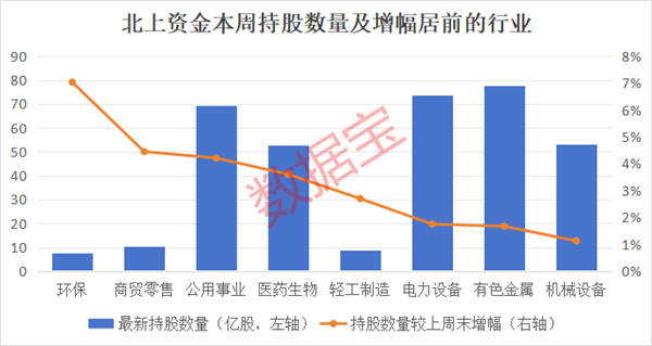 据证券时报数据宝统计,北上资金本周加仓18个申万一级行业,剔除最新持股数量低于5亿股的行业后,有8个行业持仓数量环比增加超1%,其中环保行业增幅最为显著,持股数量由上周末的7.13亿股增加至7.63亿股,增幅达7.03%。
