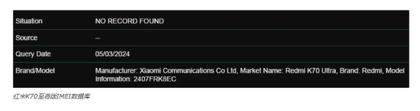 6月9日消息,近日Redmi K70至尊版在IMEI数据库中现身,具体型号为2407FRK8EC。