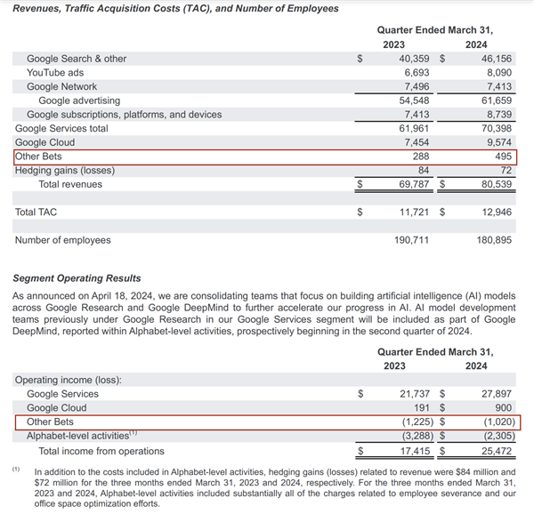 众所周知,Waymo的盈亏一直归属进Other Bets来披露。今年一季度,该项收入达到4.95亿美元(约35.9亿元),同比增长72%,收入增加;同时运营亏损为10.2亿美元(约74亿元),同比缩窄17%,亏损减少。