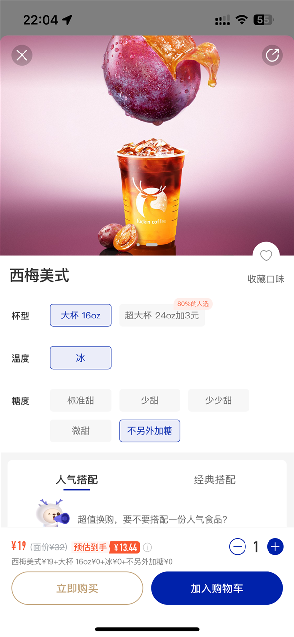 瑞幸咖啡App显示,西梅美式含新疆法兰西西梅汁,1杯约含5颗西梅,主要原料有西梅果酱/西梅汁饮料浓浆、浓缩咖啡,大杯售价19元,超大杯22元。