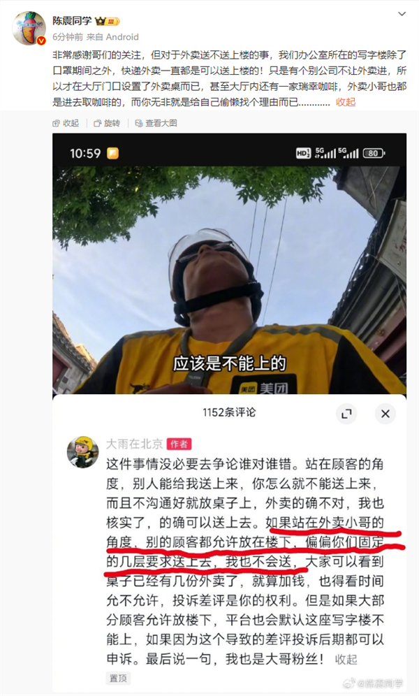 6月19日消息,近日抖音粉丝800多万的汽车大V陈震吐槽外卖不给送上楼的现象。
