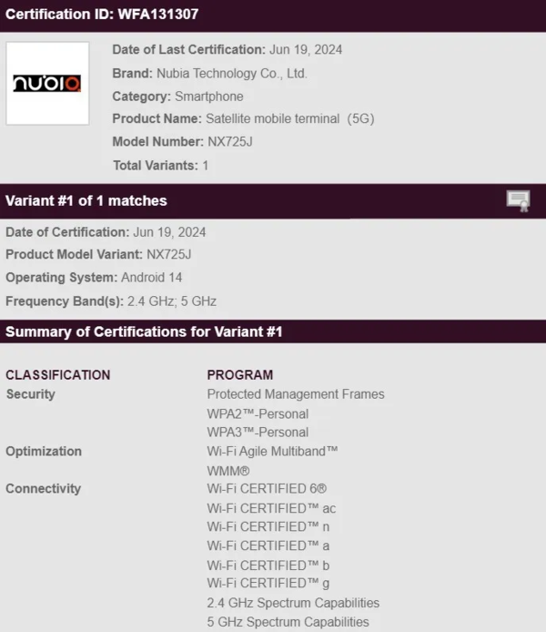 6月20日消息,近日,努比亚N60S Pro机型通过了Wi-Fi联盟认证,具体型号为NX725J。