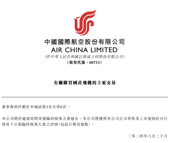 6月20日消息,中国国航今天发布公告,称公司与中国商飞签订协议,计划购置100架C919飞机(增程型),总价约108亿美元(约合784亿人民币)。