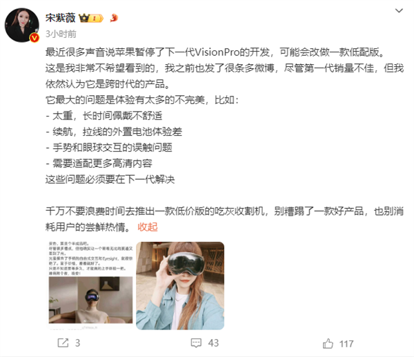 宋紫薇表示:最近很多声音说苹果暂停了下一代VisionPro的开发,可能会改做一款低配版,这是我非常不希望看到。