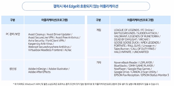 三星在其韩文产品网站上发布了一则通知,列出了三星目前认为与该新款笔记本电脑不兼容或无法进行安装的应用程序。