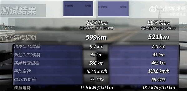最终,实测小米SU7 Max版实测续航521公里,标准版高速续航实测是486公里,Pro版实测的续航599公里。