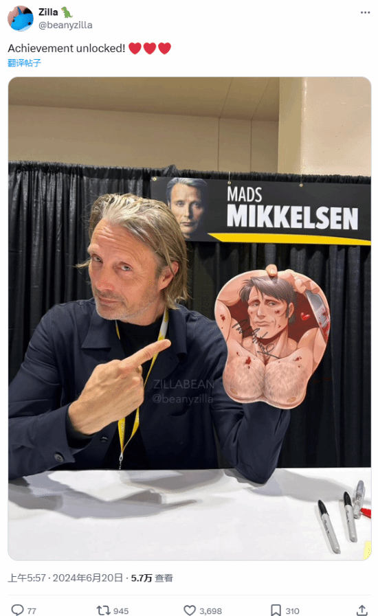 在近期的美国芝加哥动漫及娱乐展览会上,一位拔叔麦斯米科尔森的狂热粉丝想送给拔叔一张以拔叔胸肌为主题设计的鼠标垫作为礼物。