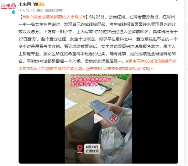 6月23日消息,据媒体报道,今天是查询高考成绩的第一天,然而云南省红河州的一名女生在查询时,却发现自己的成绩被屏蔽。