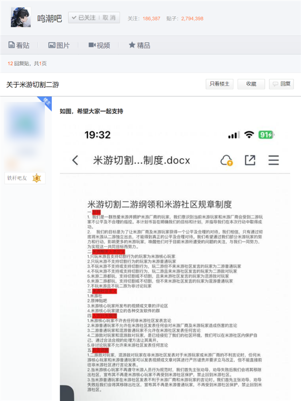 口号喊出来之后,就有不少人在各个二游论坛中转发扩散。发展到最近,已经有人搞了个 docx 文件出来。上面详细写上了米游切割二游的纲领,以及米游社区的规章制度。。。