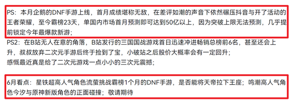 并且,上个月的《DNF 手游》大爆,甚至突破了可预测上限。腾讯的《 火影忍者 》手游,表现也十分亮眼。这还没完,下面 UP 主还提前放出了 6 月看点,星铁新池子 VS DNF 手游,鸣潮新池子 VS 原神新版本,这就更吊人胃口了。