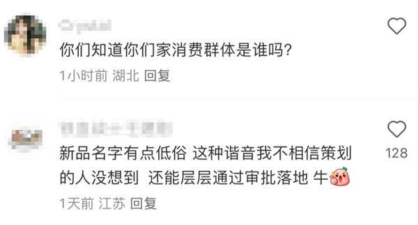 新品名字有点低俗,这种谐音我不相信策划的人没想到,还能层层通过审批落地 牛