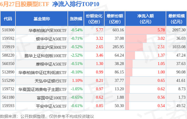 当日有71只股票型ETF基金出现资金净流入,其中净流入排首位的是华泰柏瑞沪深300ETF,份额增加了5.77亿份,净流入额为5.78亿元。净流入排行TOP10如下: