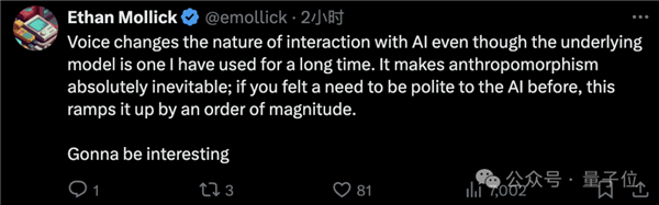 并且Ethan教授还认为,这种非常自然、拟人的语音,正是改变人类与AI交互性质的关键(虽然底层模型是我们用了很久的那个)。